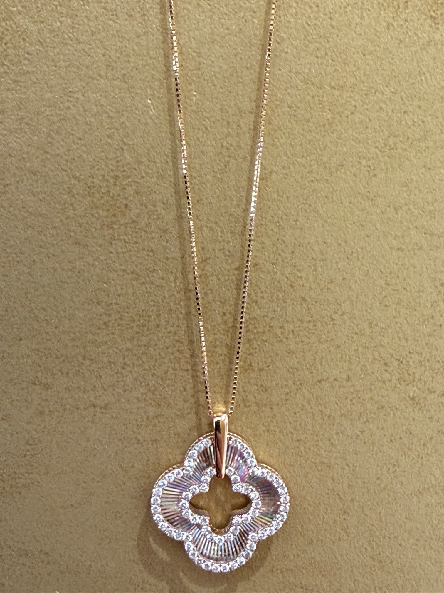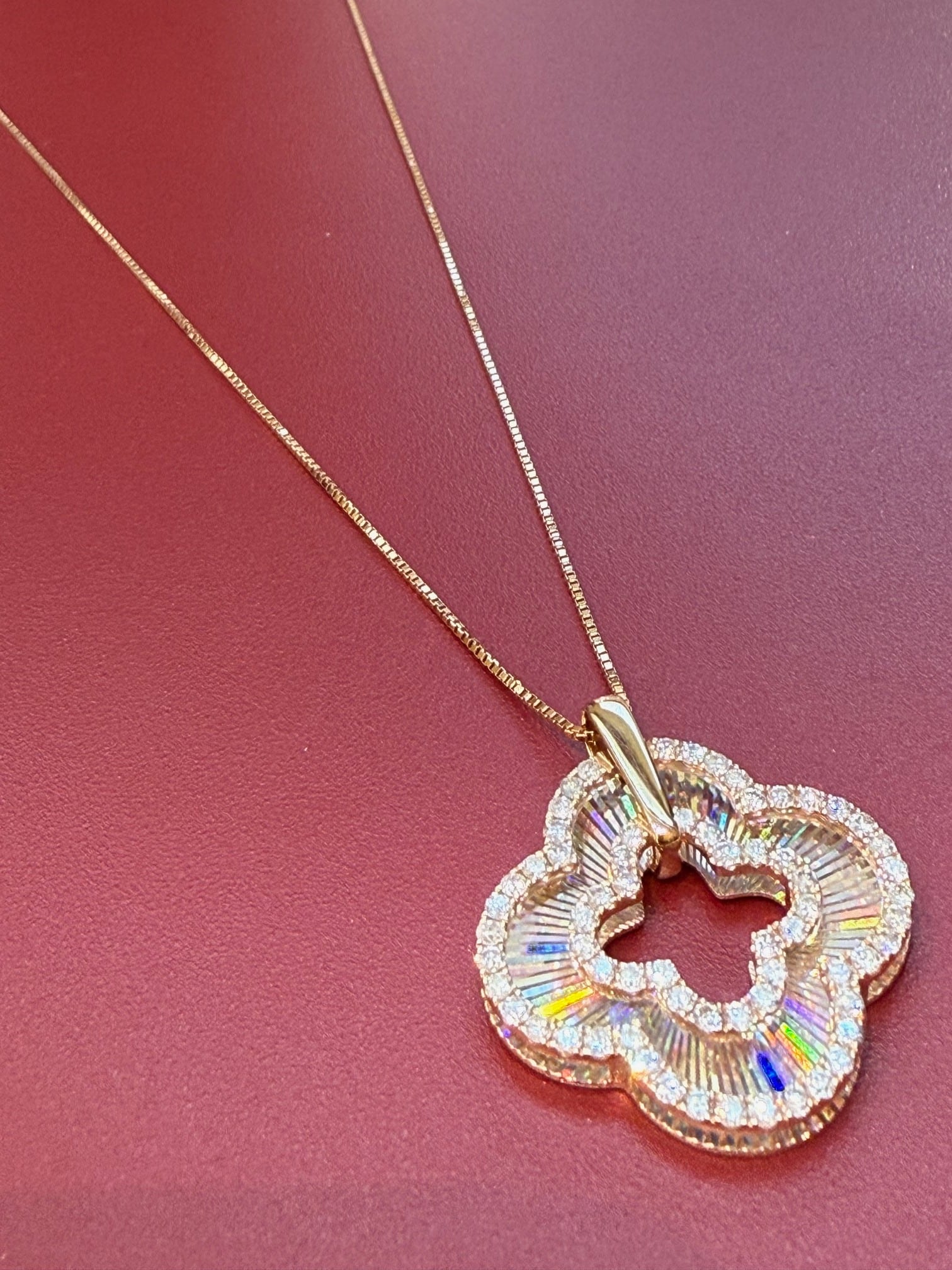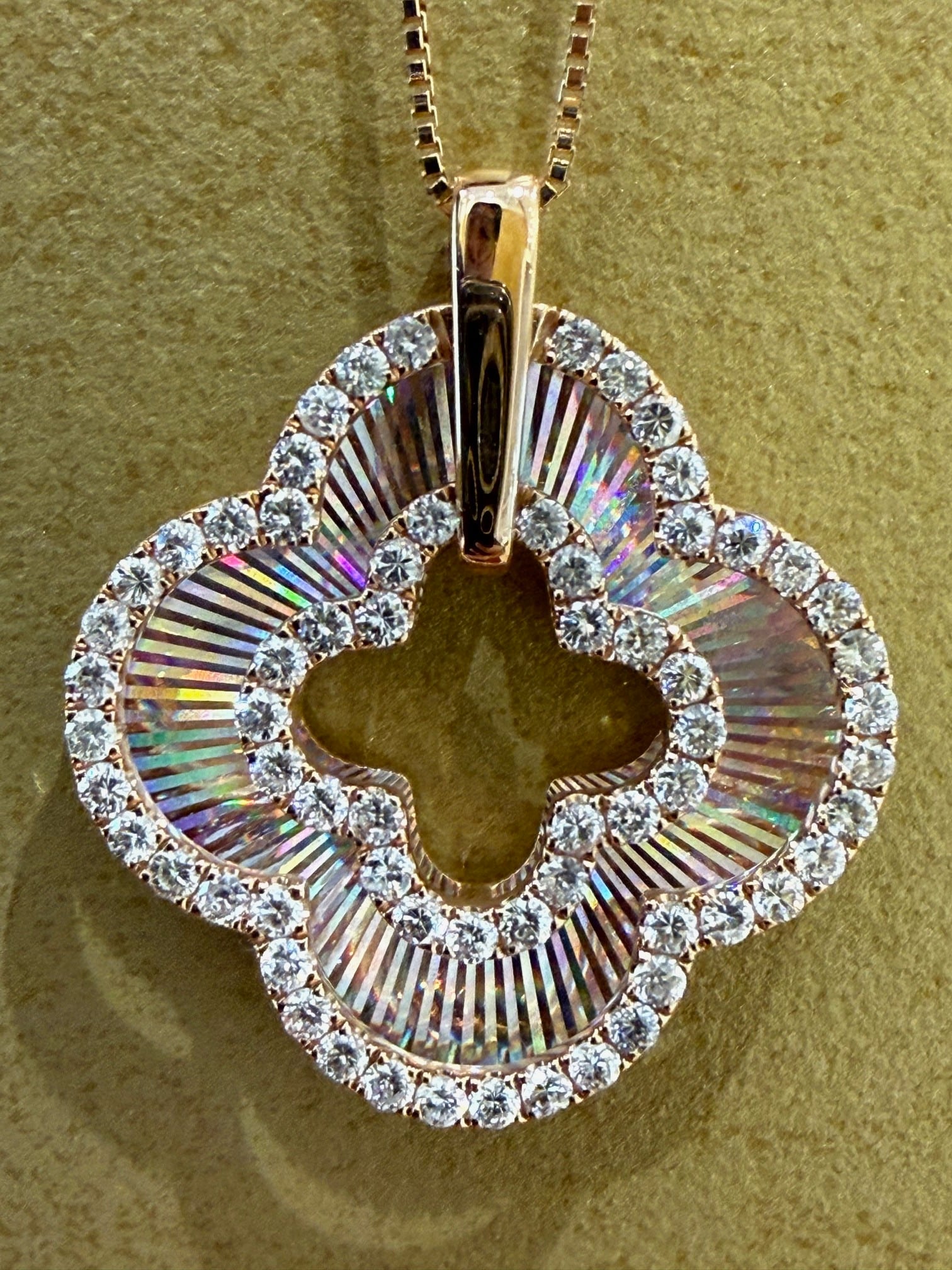 こちらはK18PGのレインボーカッティングの四葉モチーフのペンダントです。