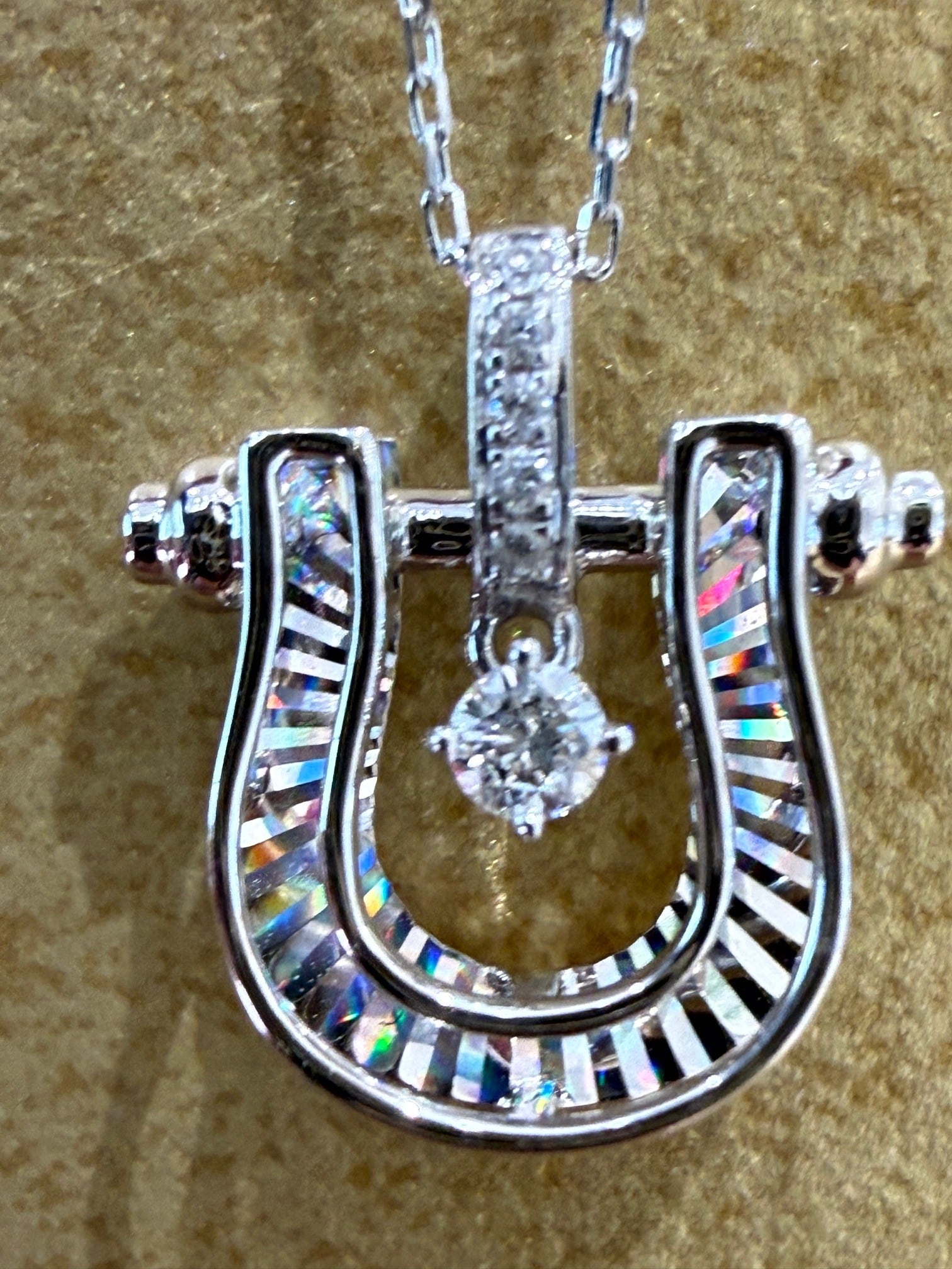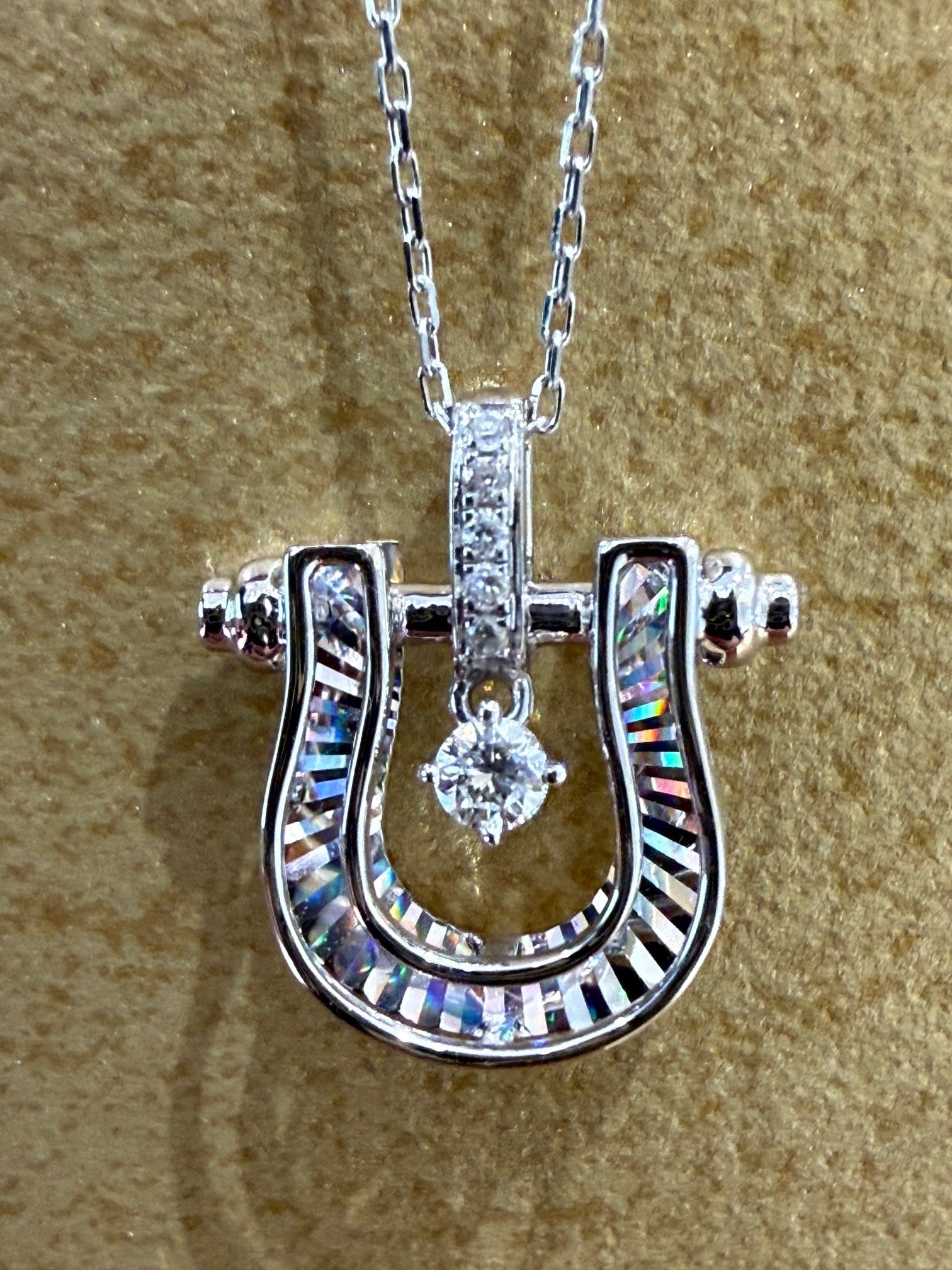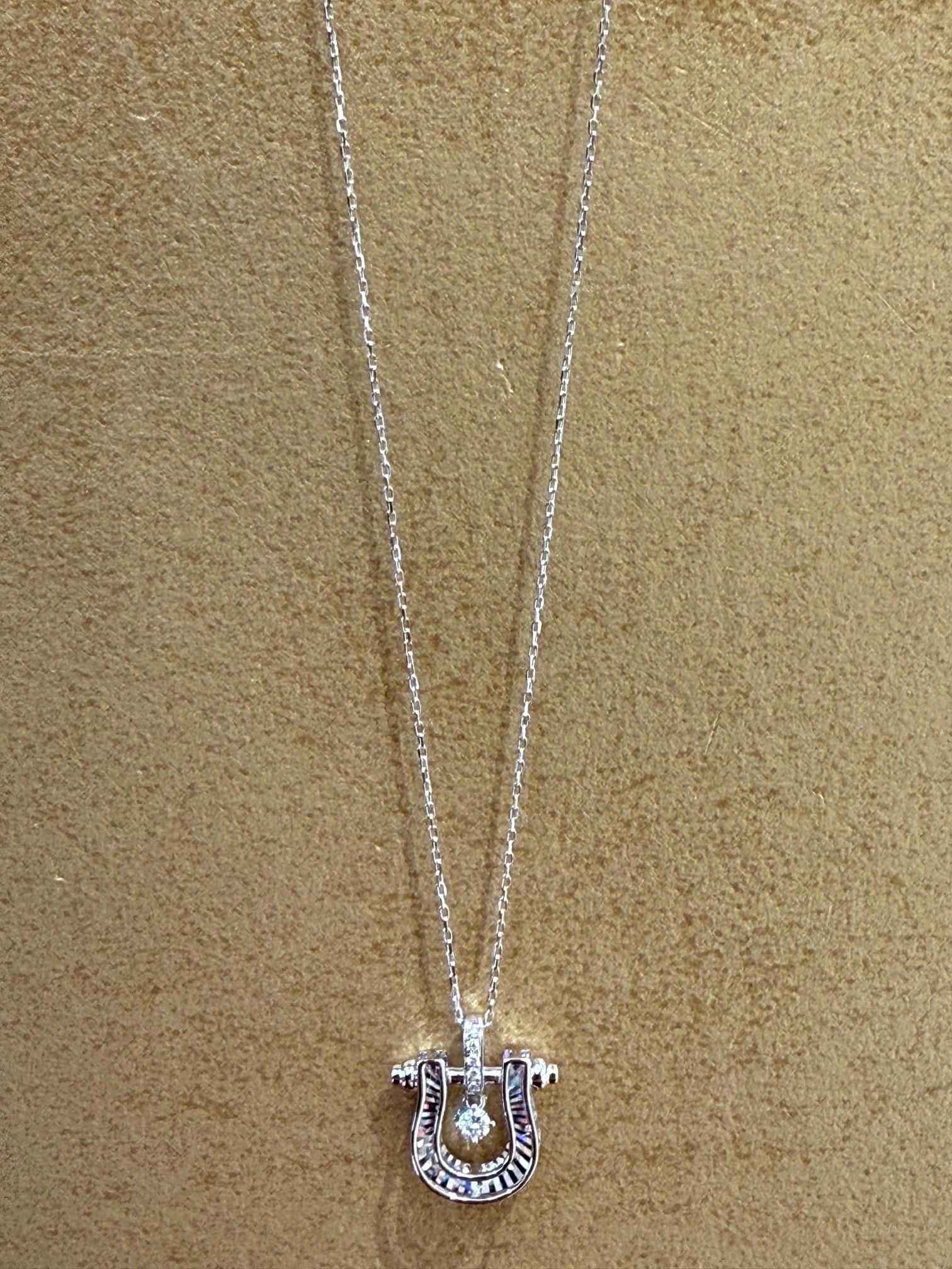 こちらはK18ホワイトゴールドのホースシューモチーフのレインボーカッティングのペンダントです。センターのダイヤが揺れるデザインになっています。