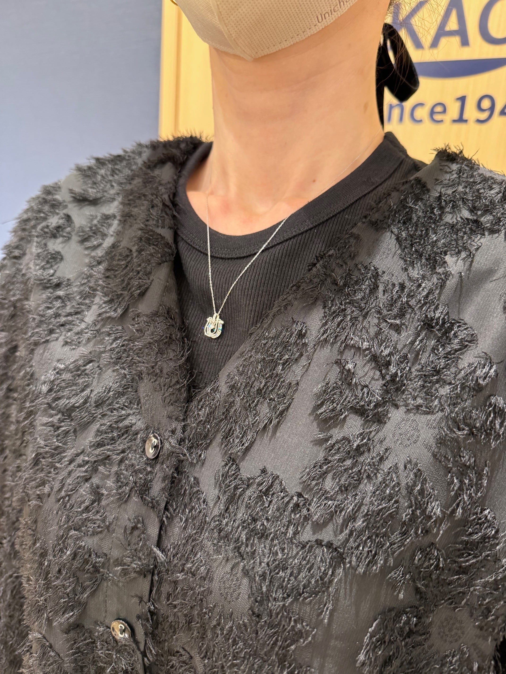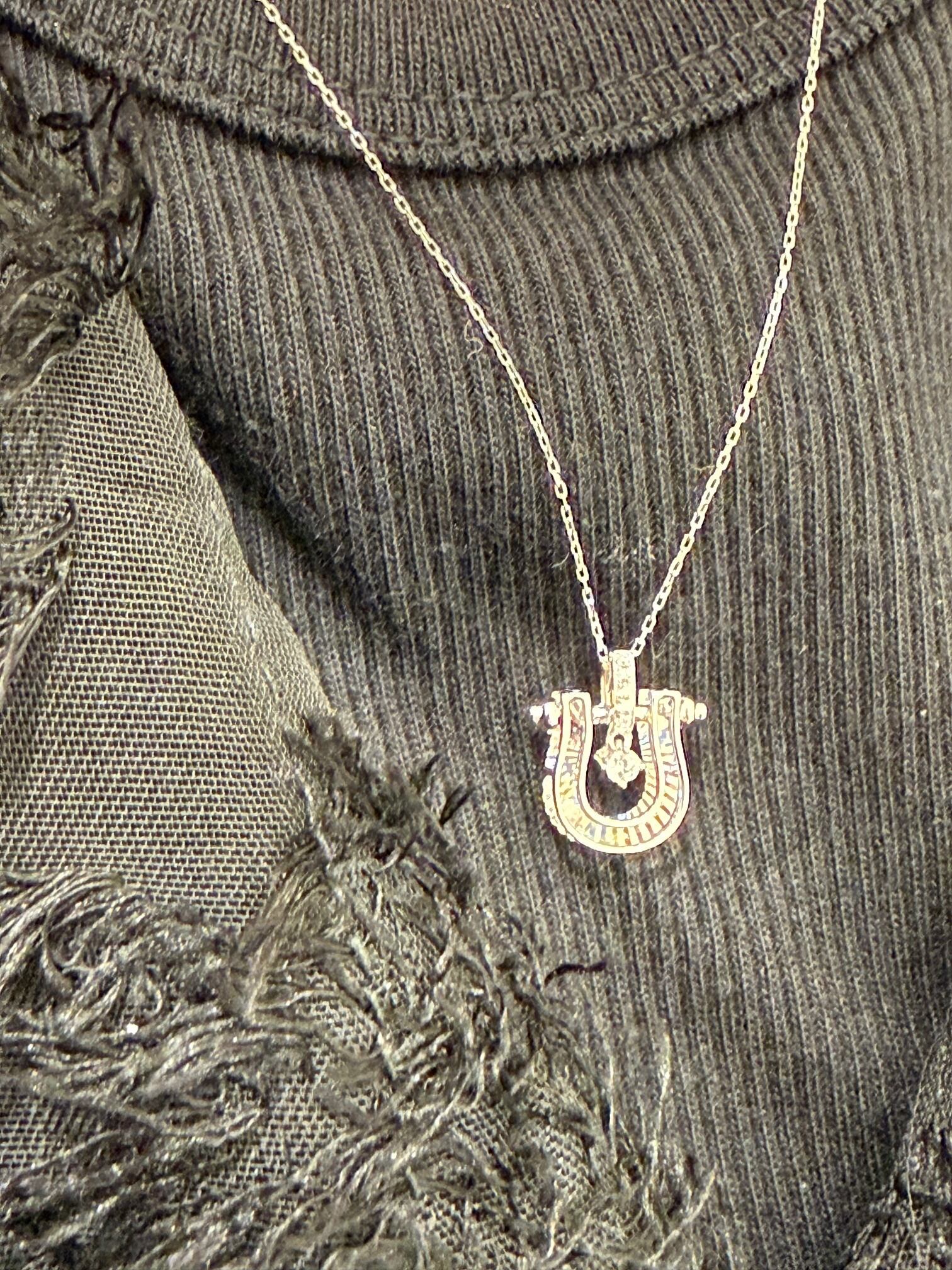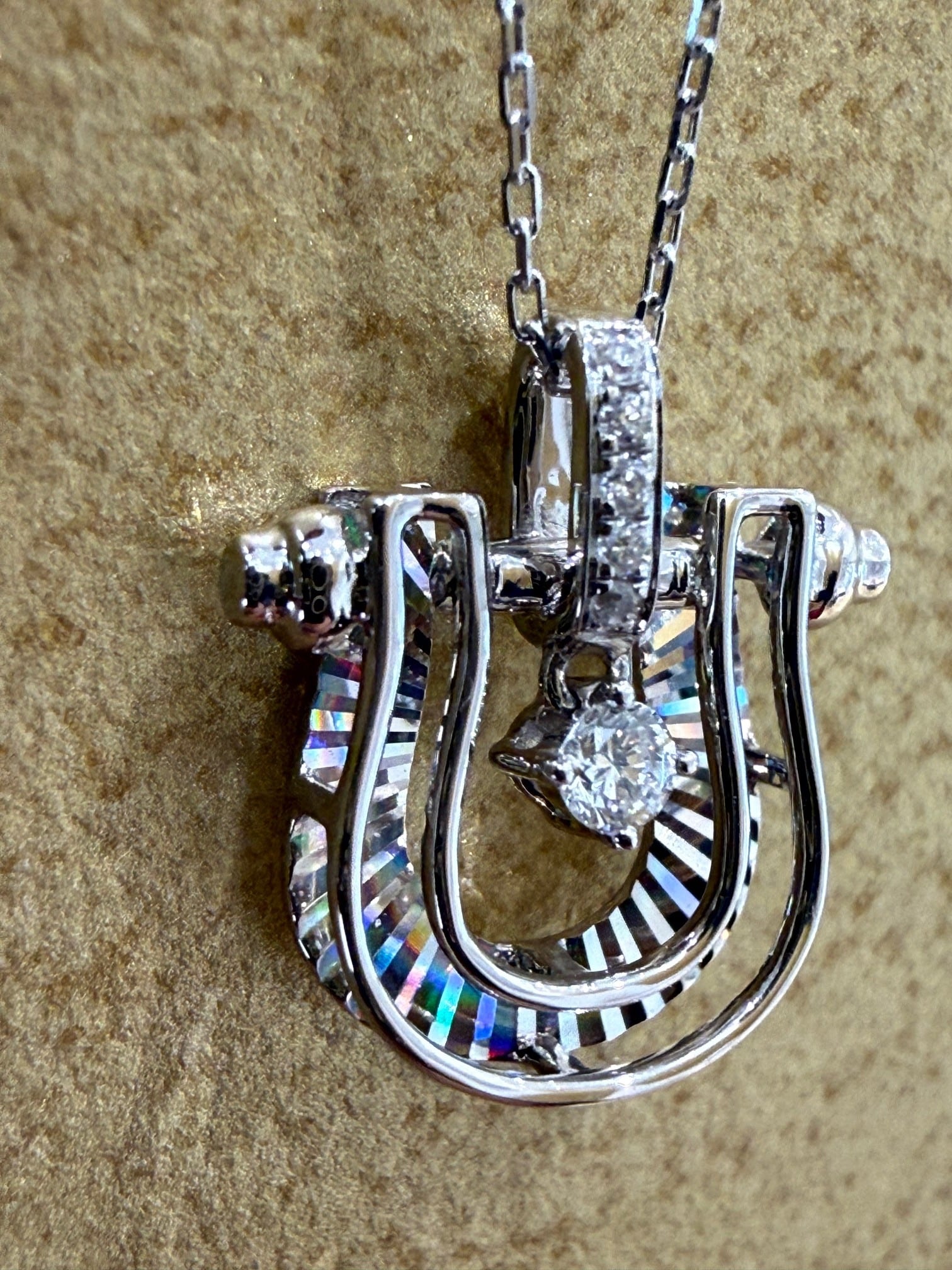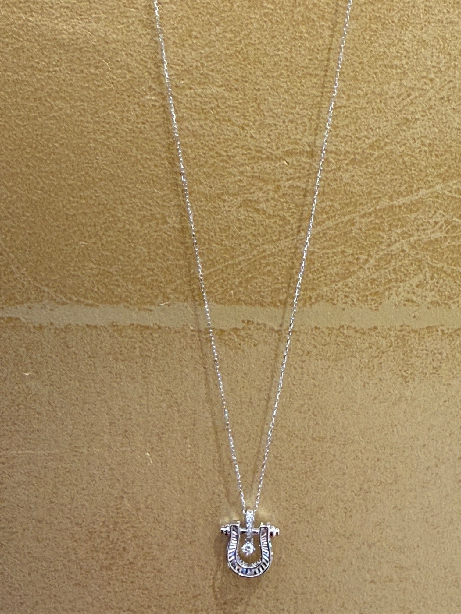 こちらはK18ホワイトゴールドのホースシューモチーフのレインボーカッティングのペンダントです。センターのダイヤが揺れるデザインになっています。