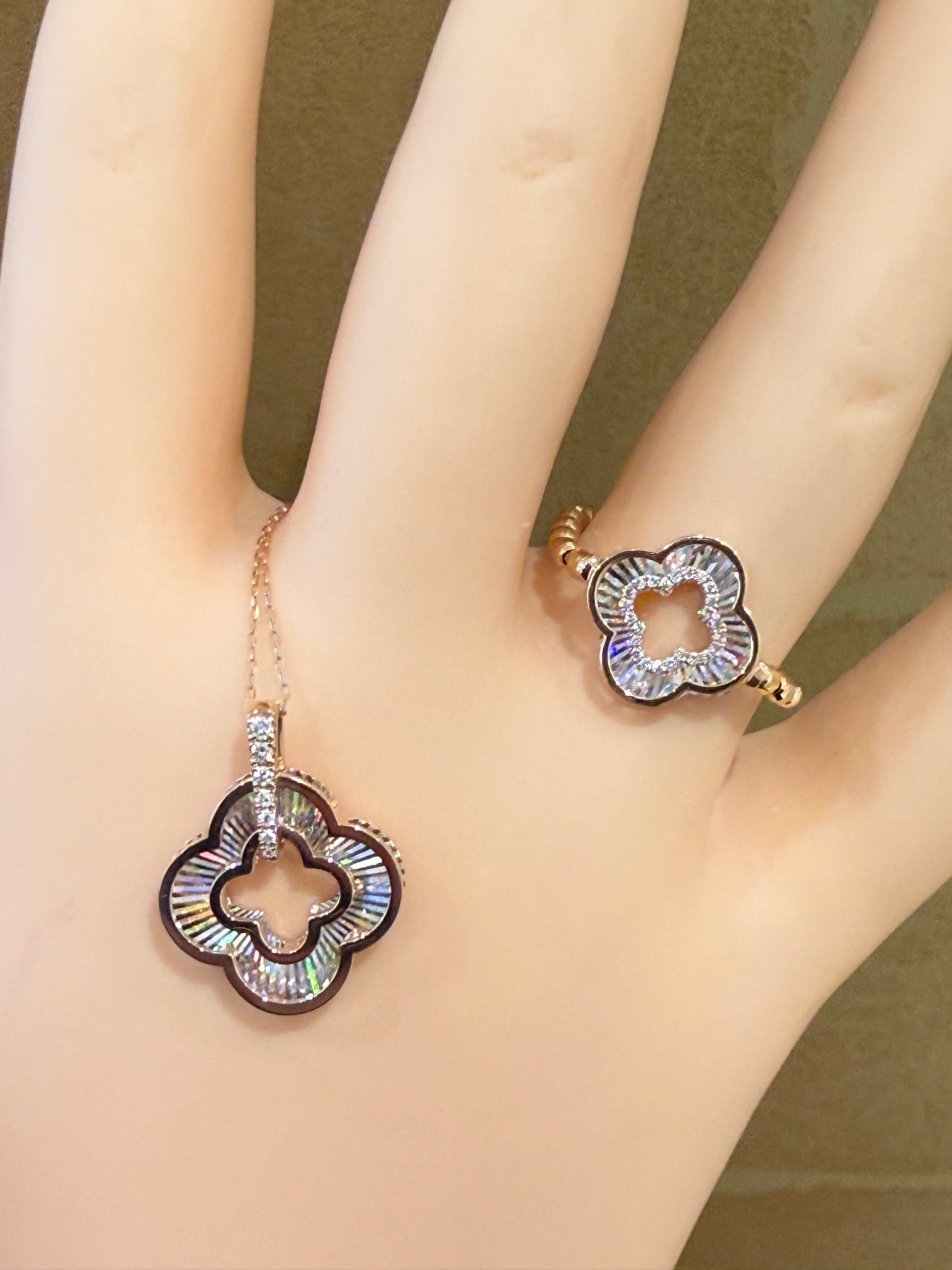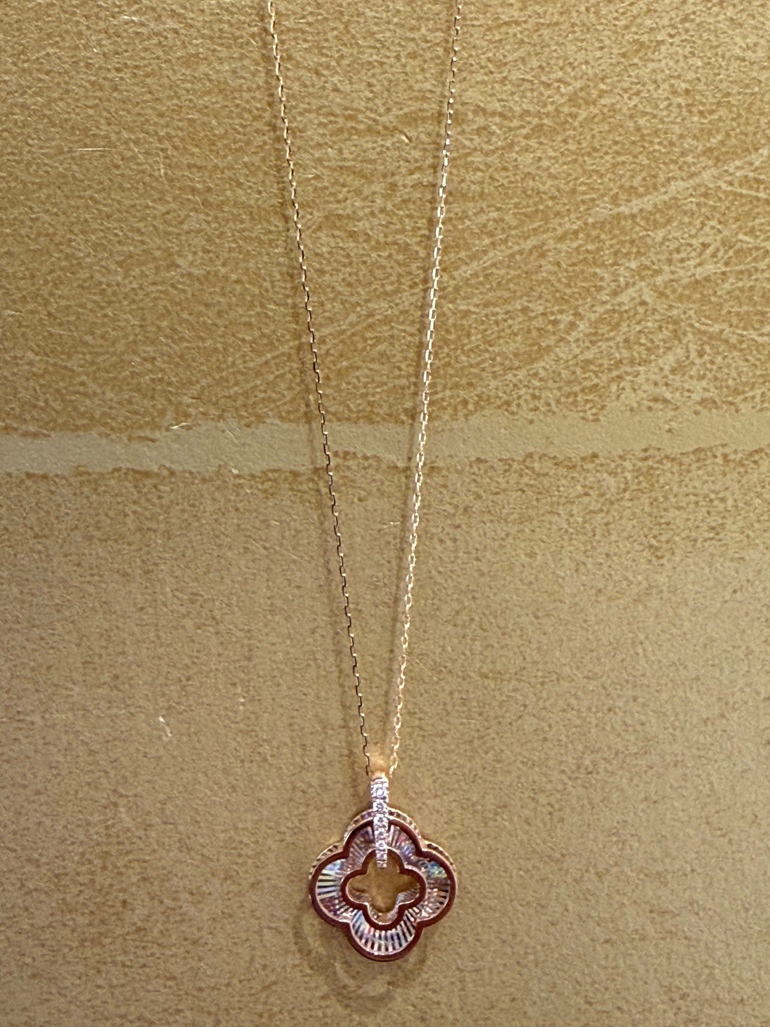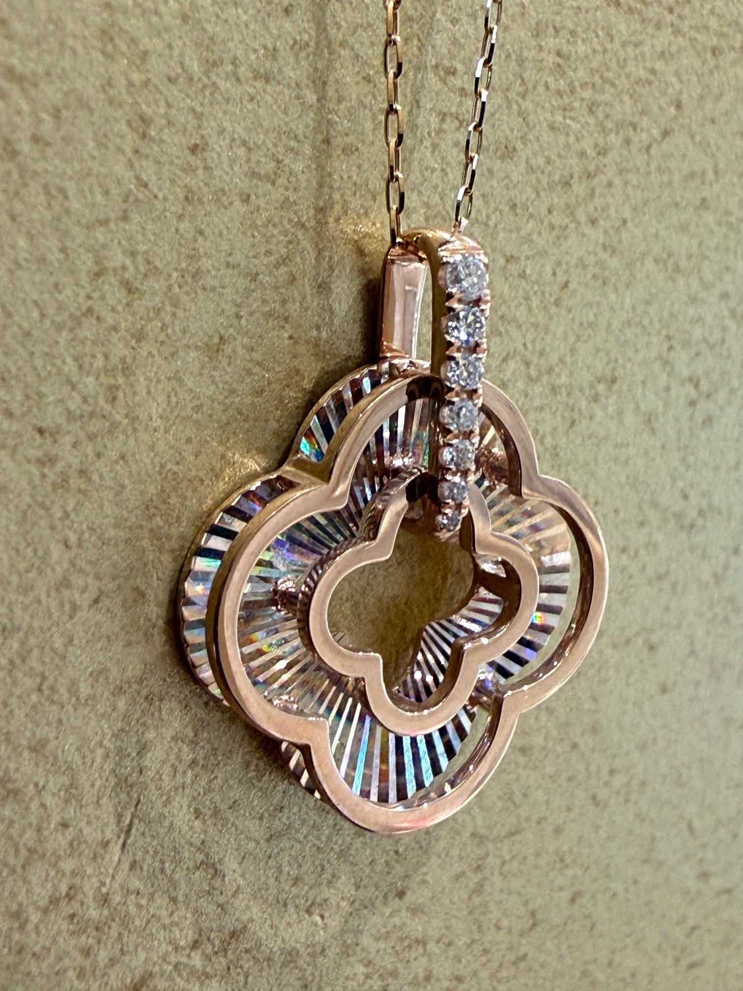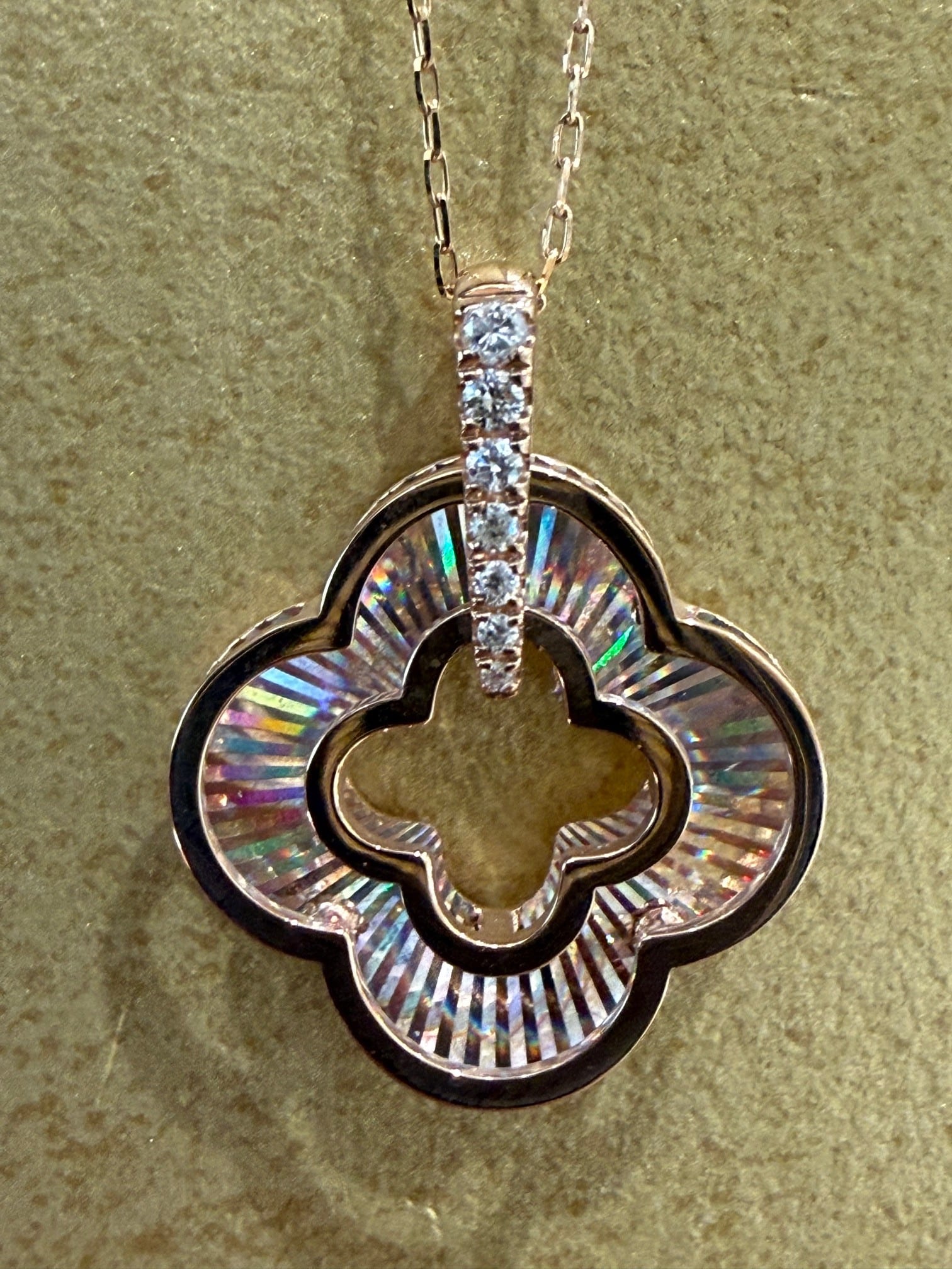 こちらはK18PGのレインボーカッティングの四つ葉モチーフのペンダントです。