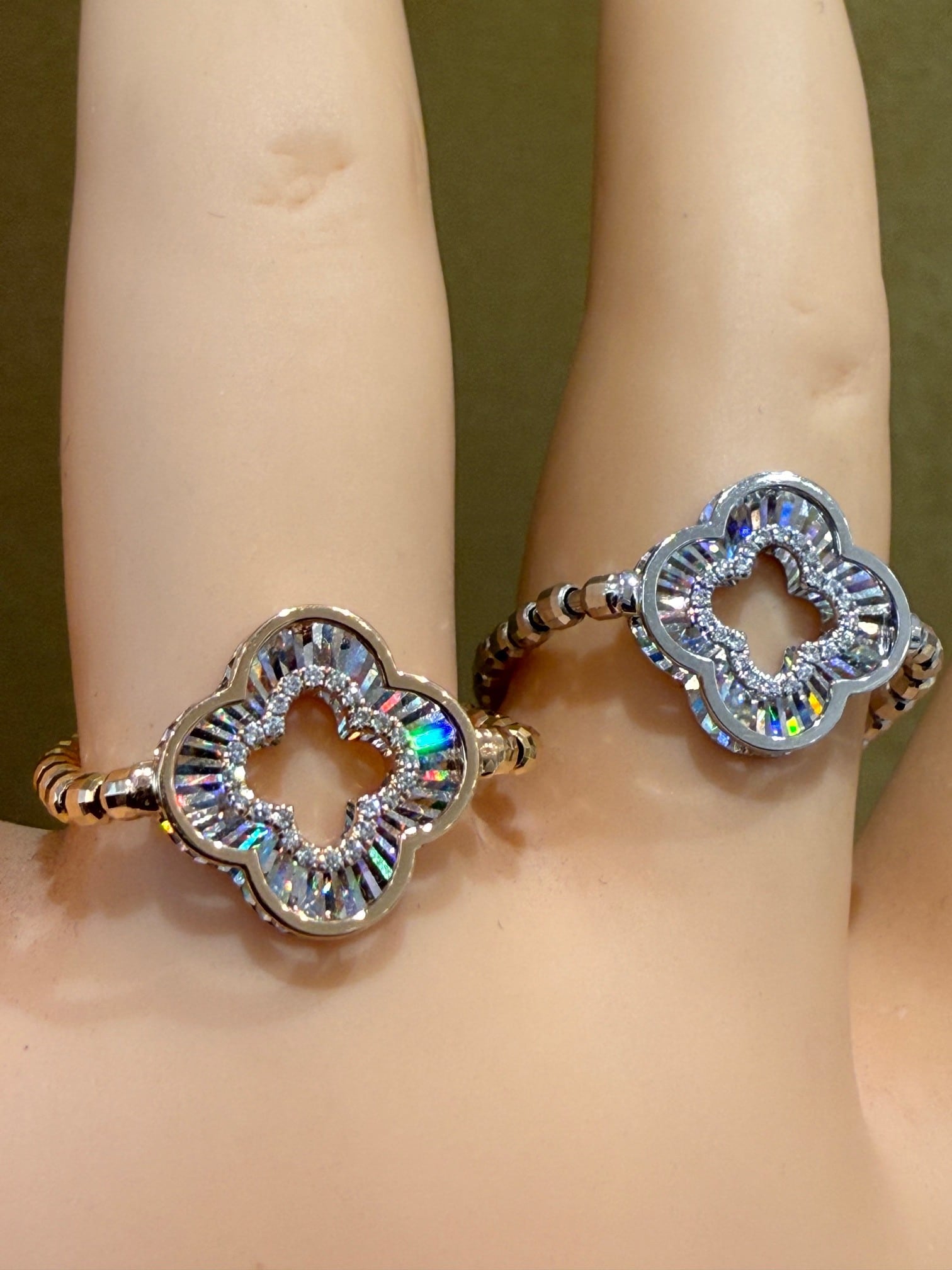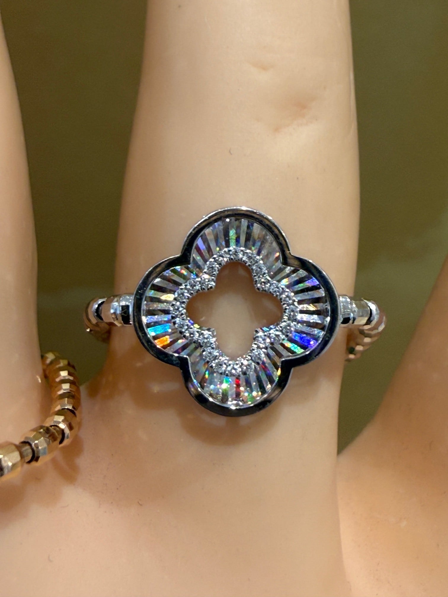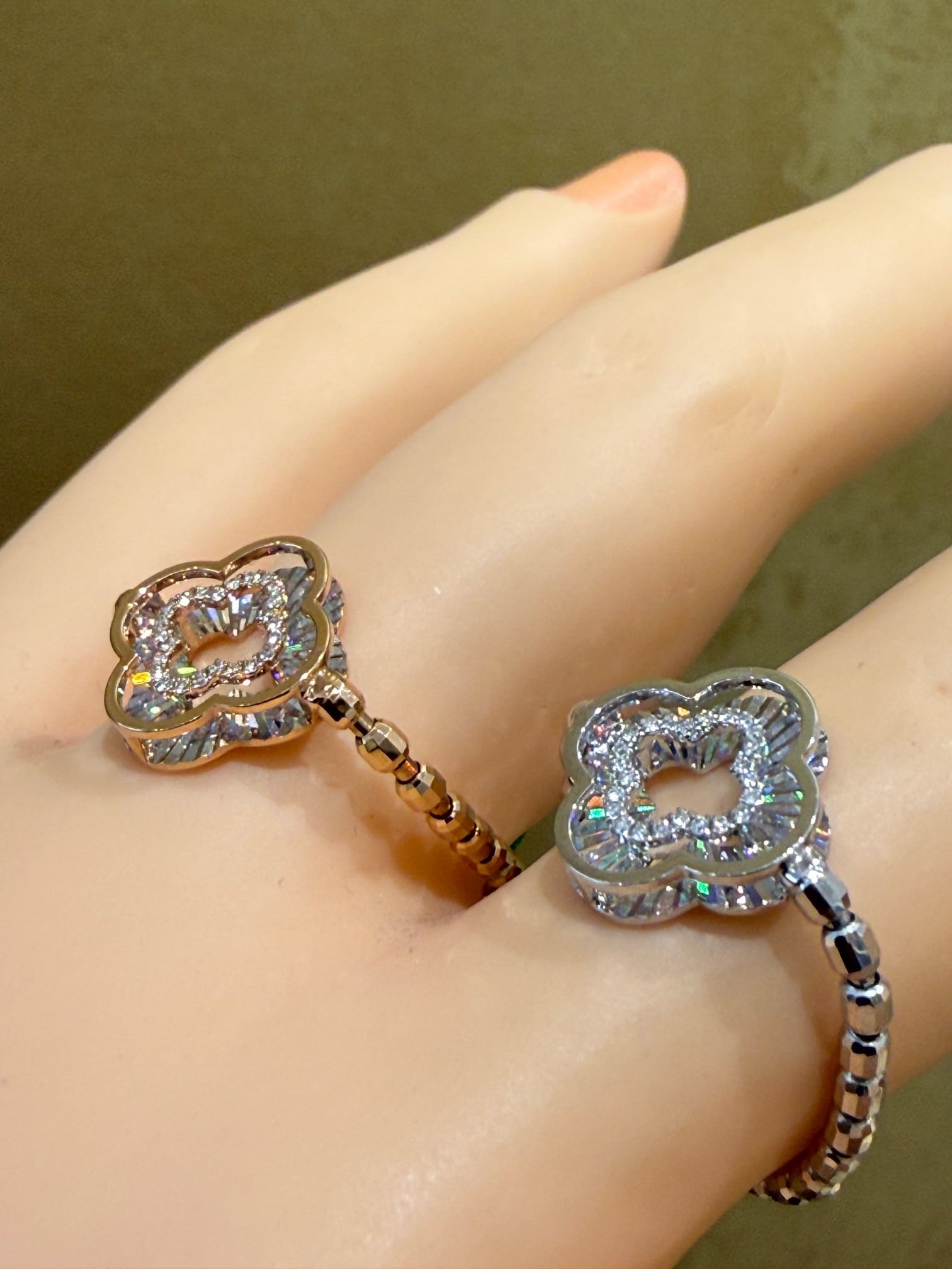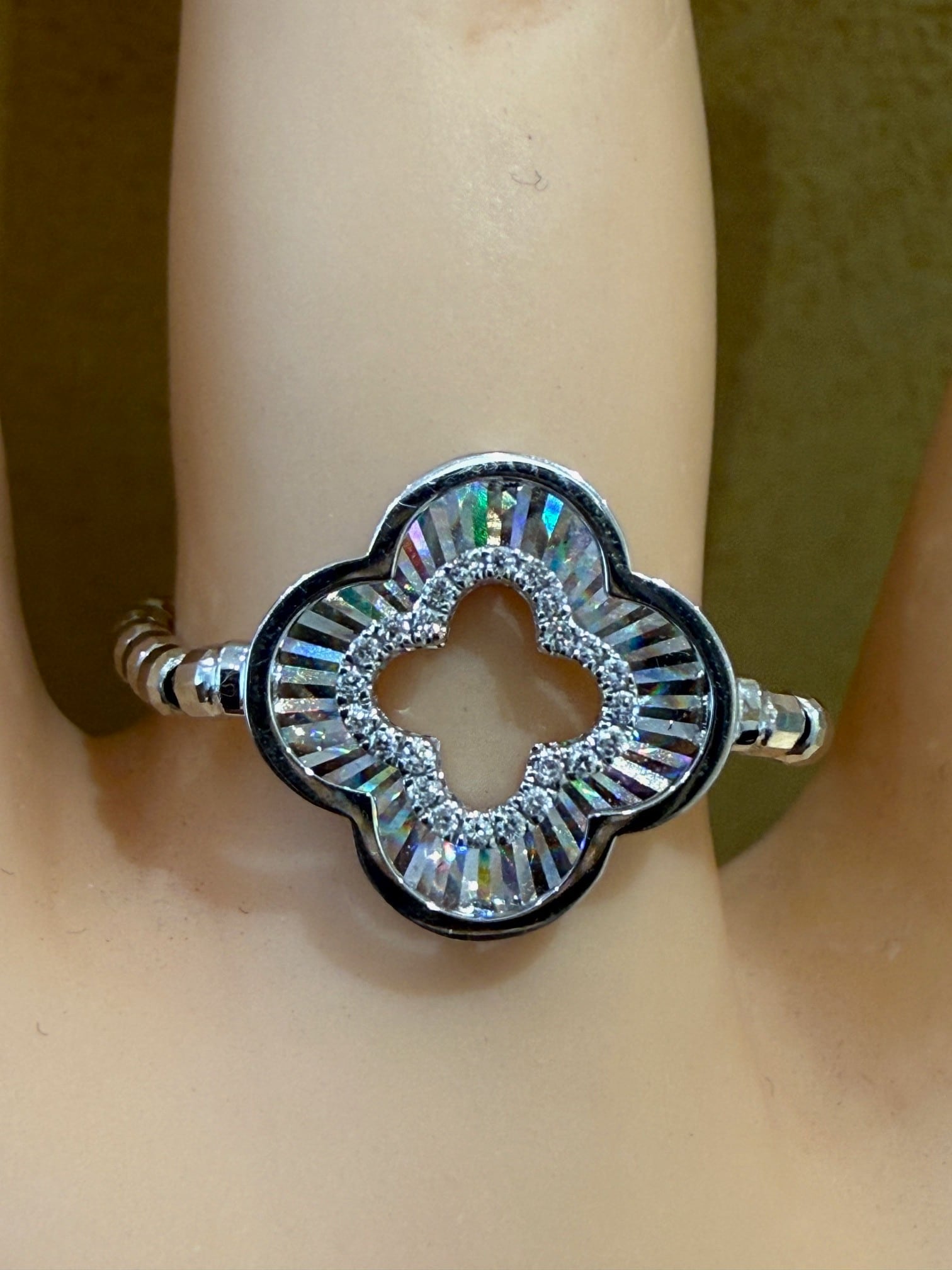 こちらはPt/K18WGのレインボーカッティングの四つ葉モチーフのリングです。