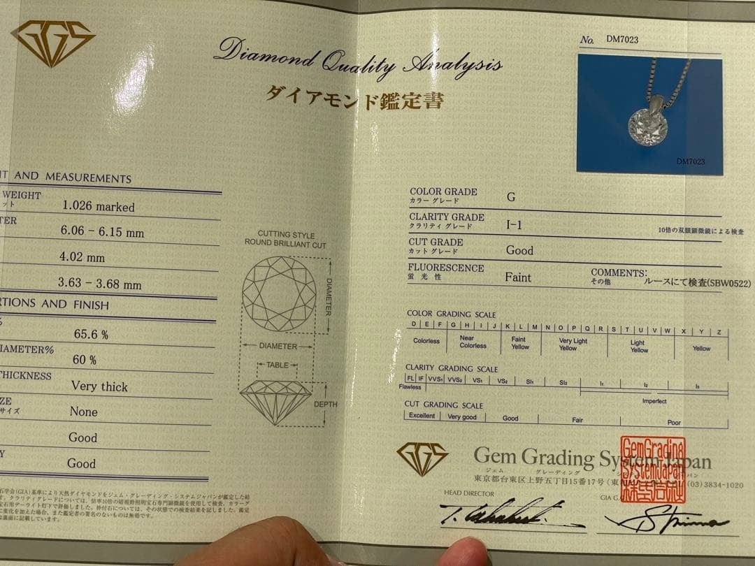Ptダイヤモンド1.026ct一粒ペンダントネックレス