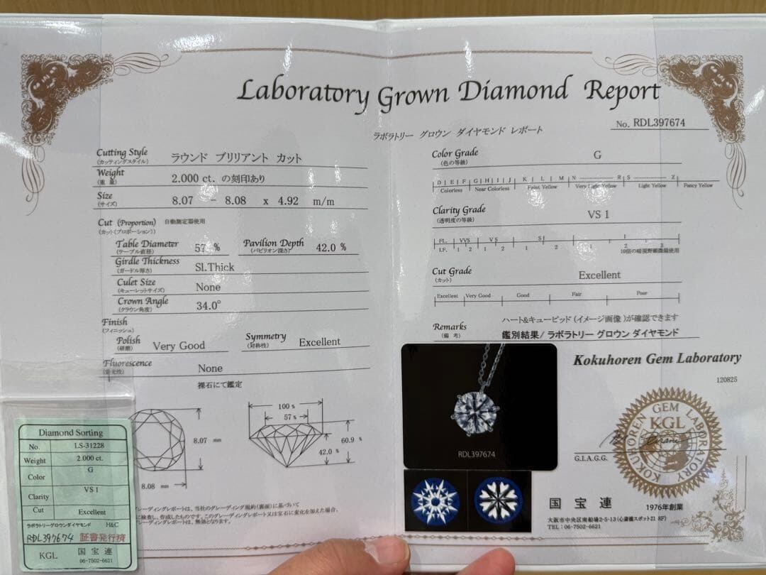Ptラボグロウンダイヤモンド 2.00ct G VS1 EX ペンダント